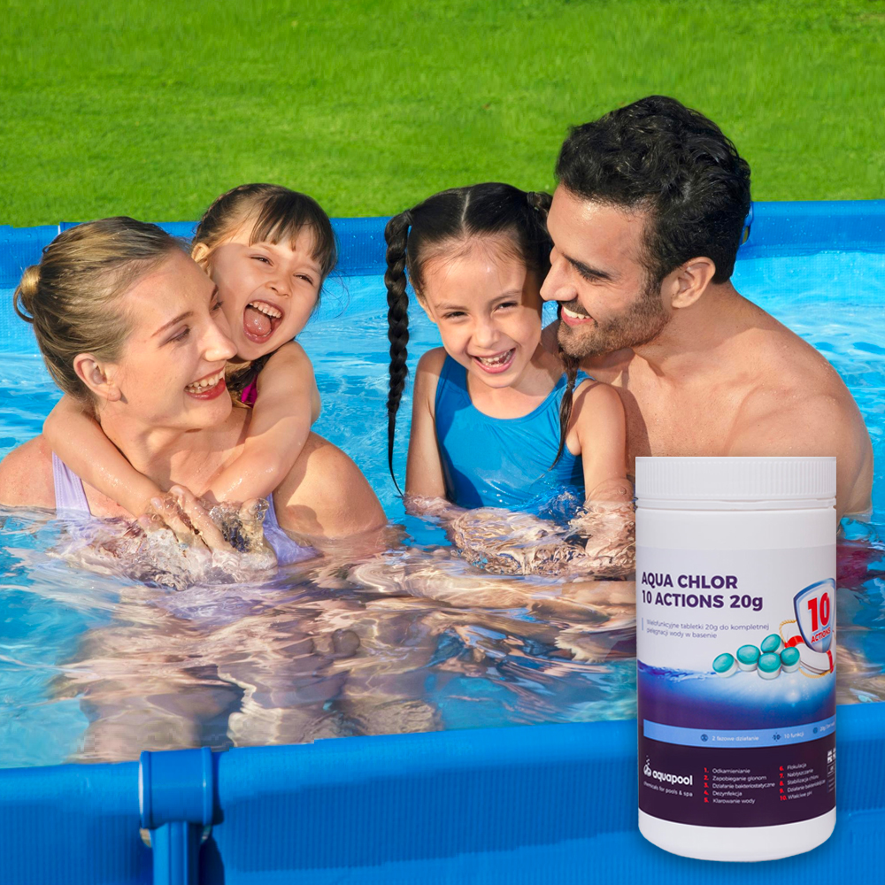 Description CHLOR DO BASENU TABLETKI 10w1 CHEMIA 20g 1 kgNajlepszy chlor do basenu na rynku europejskim – Aqua Chlor 10 Actions w tabletkach 20 g. Preparat wyróżnia dwufazowe działanie: w pierwszej fazie następuje chlorowe uderzenie (szybko zwiększa się poziom chloru w basenie i reszty składników), następnym etapem jest podtrzymanie właściwego poziomu chloru oraz aktywacja pozostałych tytułowych 9 funkcji.✅ 10 FUNKCJI TABLETEK AQUA CHLOR 10 ACTIONSCechy Aqua Chlor 10 Actions 20 g:OdkamienianieZapobiega glonomDziałanie bakteriostatyczneKlarowanie wodyDezynfekcjaFlokulacjaPolerowanieStabilizacja chloruDziałanie bakteriobójczeStabilizacja pH✅ SPECYFIKACJA TECHNICZNAAqua Chlor 10 Actions:Waga: 1 kg1kg = około 50 tabletekProducent: AQUAPOOL (Hiszpania)Data ważności: 24 miesiącePreparat zawiera: Symklosen 820 g/kg; Pentahydrat siarczanu miedzi 20g/kg; Dihydrat dichloroizocyjanuranu sodu 10 g/kgNumer pozwolenia – 6720/16 z dnia 26.07.2016✅ JAK STOSOWAĆ TABLETKI DO BASENU? ILE CHLORU DO BASENU?Wrzuć jedną tabletkę 20 g na 3 m3 wody – w ten sposób podtrzymasz właściwy poziom chloru w basenie, natomiast gdy woda jest świeża zalecamy wrzucić 2 tabletki. Tabletki należy umieścić w skimmerze lub pływającym dozowniku, ponieważ wrzucone bezpośrednio do wody mogą odbarwić dno basenu.Preparat rozpuszcza się około 2-9 dni w zależności od temperatury wody i poziomu chloru w basenie. Środek łączy w sobie działanie chloru szok, antyglonu, flokulantu oraz chloru wolno rozpuszczalnego do tzw. stałej dezynfekcji. Stosując Aqua Chlor 10 Actions należy korygować również poziom pH wody za pomocą środków Aqua pH- I Aqua pH+ nie możemy również zapomnieć o badaniu wody testerem.Prosimy o zachowanie środków ostrożności przy stosowaniu chemii – chemię należy dozować w rękawiczkach. Wszelkie informacje znajdują się na etykiecie i ulotce oraz przewodniku dołączonym do każdego zamówienia.✅ Środek ten przeznaczony jest przede wszystkim do mniejszych basenów ogrodowych, stelażowych i rozporowych takich firm jak Bestway i Intex.